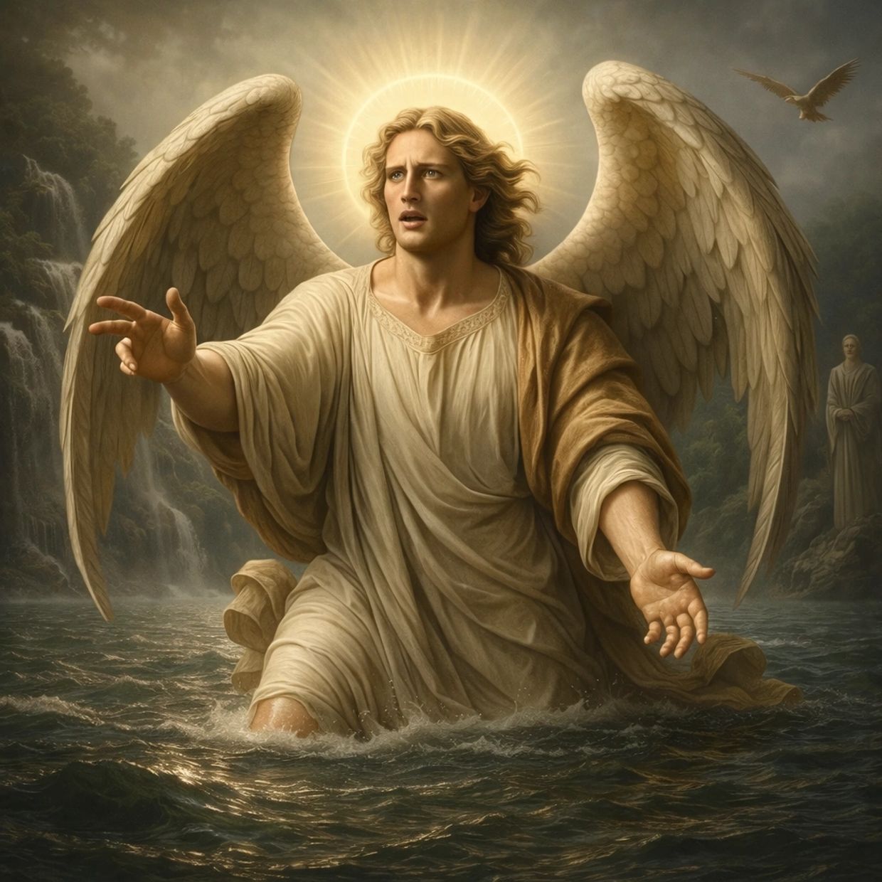 A Call to Repentance: The setting, with the angel standing over the people, symbolizes a moment of introspection and repentance. The lighting, highlighting the angel, contrasts with the shadowed figures below, symbolizing the need to turn away from darkness and return to God’s light.