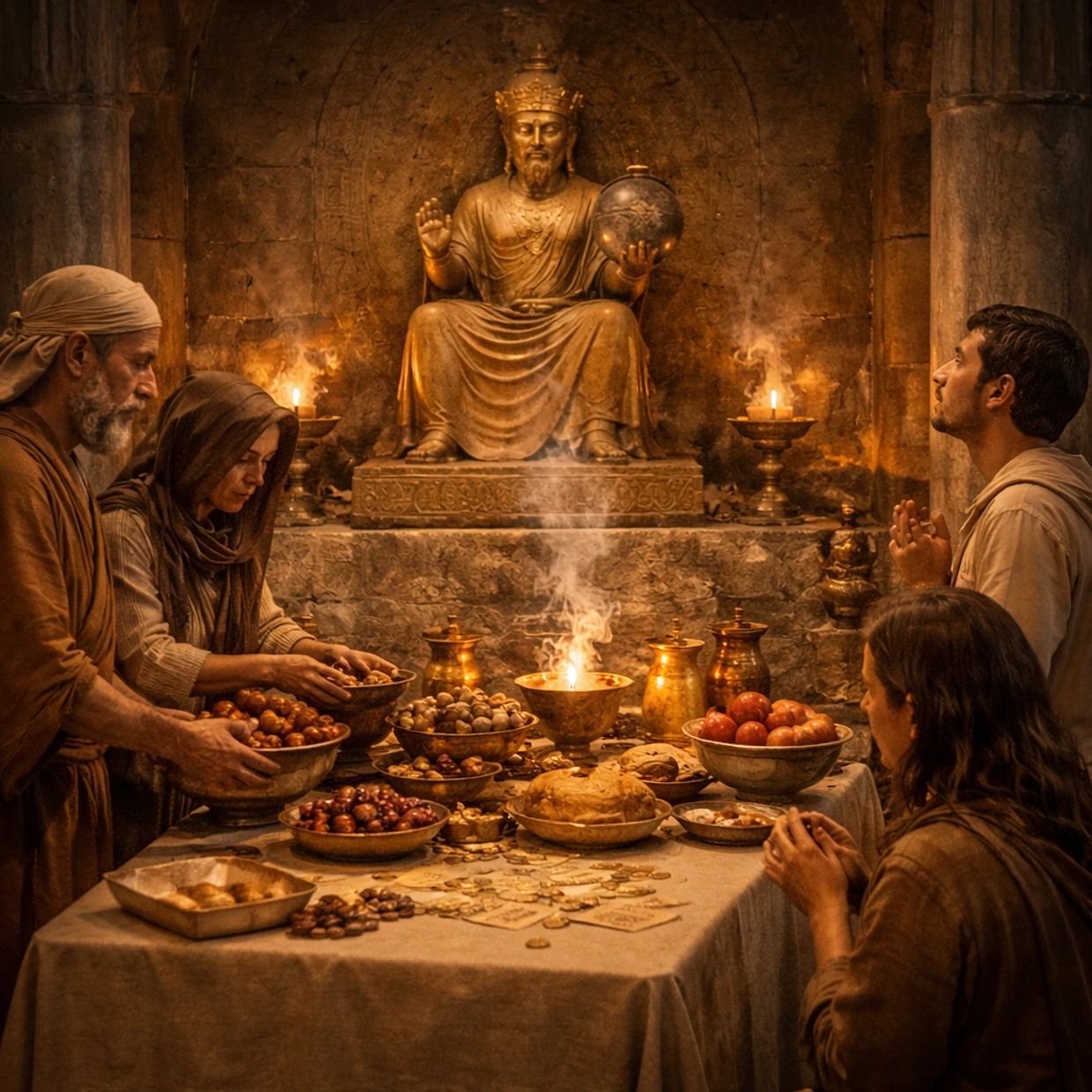 Symbolism: The image emphasizes the stark contrast between the worship of the true God and the seductive nature of idolatry. The lavish offerings and sacrifices presented to the calf reveal the deep-seated temptation and the human inclination to turn away from God in moments of uncertainty.
