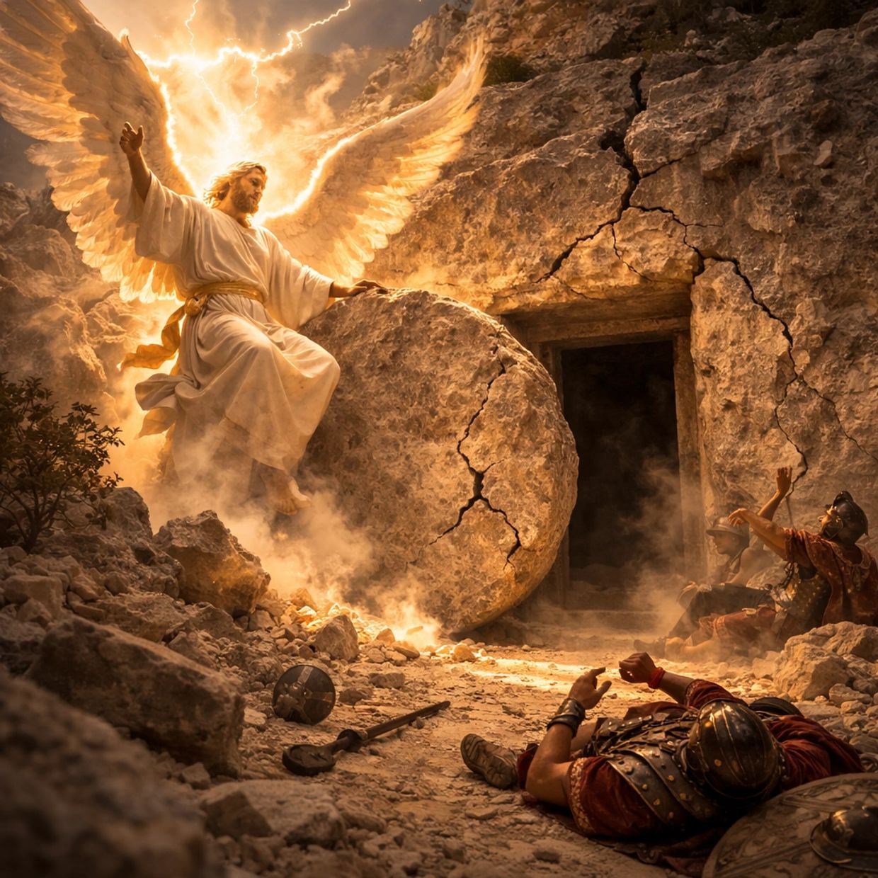Context: The resurrection was accompanied by a powerful earthquake as an angel descended from heaven to roll away the stone from Jesus’ tomb.